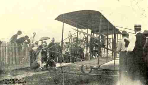 of aerial apparatus, contracts were made with Carl E. Myers, of Frankfort, N. Y., for a dirigible, with W. H. and Mrs. Martin, of Canton, O., to bring their big monoplane glider, with which they were reported to have made a number of sensational flights at home, drawn only by a farmhorse, and also for a number of parachute drops, and kites, and other attractive features. There was every prospect of having a remarkably find exhibition. But both ill-luck and that outside influence which has never missed a chance to strike and entirely smashed up his machine, destroying all hope of its taking part in the program. Then a wind storm arose and badly damaged the bag of the dirigible just as it had been filled. When Mr. Curtiss did come, although he brought a beautiful and perfedt machine, he did no flying. Nor had any of the other machines been able to be got ready to take the lead. Large prizes were offered, but htey were not announced sufficiently early perhaps to have the effect they otherwise might. The accident to Mr. Kimball was one of the most distressing blows, for it happened just when he had got the machine perfectly balanced and acting excellently. Mr. Kimball indeed, has been a strong runner in the hard luck stakes all the year, and several times the sympathies of the Society have gone out to its genial and dauntless Secretary. In March he reconstructed a glider, which had originally been used by E. LaRue Jones, Editor of "Aeronautics," and in a trial from the catapult, a strong upward gust caught the front |