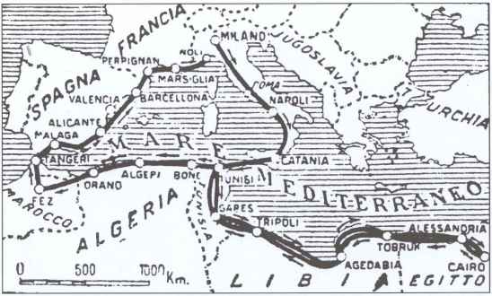 Airplane Breda 15. 1929 December 16 - 1930 January 18. The stages were: Cinisello (Milano) - Roma - Catania - Tunisi - Gabes - Tripoli - Bengasi - Aboukir (Mesra) - Tobruch - Bengasi - Tripoli - Tunisi - Algeri - Orano - Fez - Malaga - Alicante - Barcellona - Marsiglia - Noli: 11.000 km. |