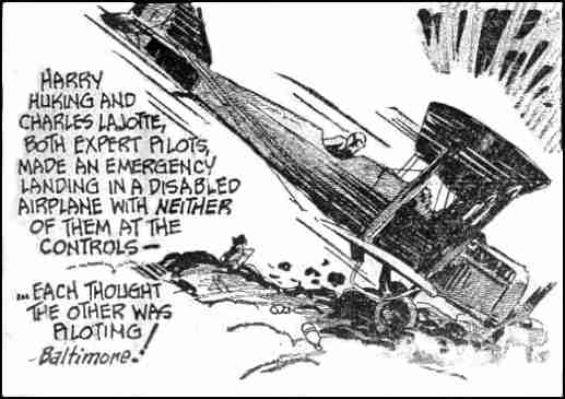 from Ripley's Believe it of Not One never knew what might happen, and quite often something did. I was immensely impressed when running through Harry Huking's log book recently to note so many entries like, "Forced landing, no oil pressure"; "Forced landing, broken fuel line"; and "Forced landing, dead stick". In my own log I found on one page notations of four flights, three of which ended up in bang-ups of one kind or another, and two of which occurred on the take-off. Those were the days when it was fine to be young, and on looking back at them now, I sometimes wonder. Well, to get back to my story, there we were, Harry and I, up in the air over Baltimore, waiting for Lee to show up. I was doing the flying from the front seat, for Check Pilot Huking had a reputation as an aerial photographer. Suddenly, when about 2,000 feet over the harbor, our engine stopped dead. I shouted in the ominous stillness, "You take it, Harry!" and immediately let go of the stick and bent down with my head in under the cowling, frantically trying to turn on the emergency fuel tank, the petcock of which was stuck fast. Our plane banked steeply to the left, so steeply in fact that our entire 2,000 feet of altitude was completely lost in making one turn. We barged over a schooner in the bay at about one hundred and something miles per hour, just missing its masts by inches. Then we struck on an ash dump on the water's edge, and kissed the ground at least half a dozen times, before coming to rest up on our nose, in the middle of the dump. We climbed out and reufully surveyed the damage, while a small crowd assembled from the near-by docks. The propeller was broken and the radiator bent, and that was all the damage that was done. After we recovered our breath, I said, "You certainly came in fast enough, Harry." He looked startled, and answered, "Why, I didn't have the stick." And to our mutual astonishment, on comparing notes, we found that the airplane had actually landed itself. Neither of us had as much as touched the stick from the time the motor had stopped until it had finally come to rest on its nose. Harry, who was my senior, and who had never heard or even suspected that I had turned the controls over to him, had been just about to cuss me out for diving in so fast and for coming so close to the schooner, when I had taken the wind out of his sails by mentioning these facts first. There may be other similar cases, but this one is the only one that I ever heard of that an uncontrolled airplane not only landed itself, but picked the only possible terrain to do it on, and at the expense of only a bent prop and radiator. |