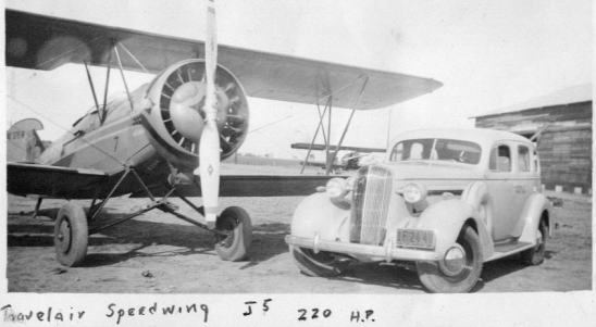 Here's the app. 1935 car with a "Travelair Speedwing J5 220 H.P.". The identical-appearing car was in the picture taken at Mt. Rushmore. Does anyone know the ownership of this car or this airplane? Is it just my imagination, or does it look like the new car was posed carefully in front of the new airplane? Doesn't it almost look like an ad out of "True" magazine, showing the latest in high-tech transportation?