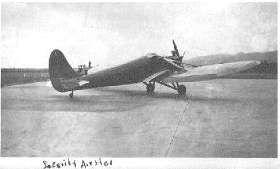 "This is a Security Airster S-1A, with a tail number of NC-13792. The plane was manufactured in 1933 by the Security National Aircraft Corp., owned by the designer - Winfield B. Kinner. Floyd Nolta was the 4th owner, from 1935 to 1938, when he sold it to George Jess of Orland, CA. (Jess was later killed fighting a forest fire in California.) This plane had its registration cancelled in 1948, with Duck Air Services of Portala being the ninth and final owner.
