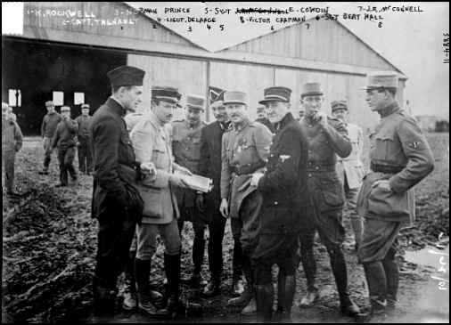 Left to Right:VICTOR CHAPMAN, ELLIOTT COWDIN, BERT HALL, WM. THAW, LT. DELAAGE, NORMAN PRINCE, J.R. MCCONNELL, K. ROCKWELL, CAPT. THENAULT Library of Congress Collection, 9-20-07 |