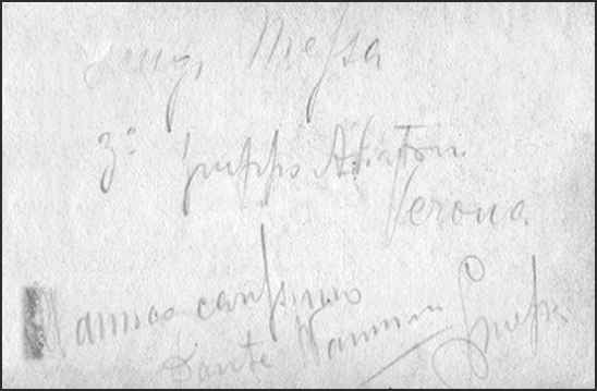 Back of post-card This is a very interesting document because Baldeschi Federico was sending his post-card to Dante Nannini from a war zone and nobody was allowed to send letters from the war zone without the naked eye of the authorizing officer and in fact the officer after reading the text he stamped on the card a bleu stamp granting a certificate that in reality the text was actually written by the person sending the card i.e. by Baldeschi Federico and this obviously for safety purposes. Unfortunately the paper of the postal stamp covered the number indicating the position of the flame-thrower department in the war zone from where F.Baldeschi sent his post card to his friend Nannini Dante a pilot lieutenant flying for the 3° section S.V.A. located in a secret and unknown war zone "Zona Guerra" Italian text: Zona guerra 14 X-18 2° SEZIONE AUTONOMA SPECIALE LANCIAFIAMME DA POSIZIONE ? Spedisce Baldeschi Federico Affettuosi infiniti saluti e auguri tuo affezionatissimo F.Baldeschi Translation: War zone 14 october 1918 2° SPECIAL AUTONOMOUS DEPARTEMENT FLAME-THROWER FROM POSITION ? Forwarder Baldeschi Federico Warm hearted and infinitely healthful wishes and regards yours faithfully F. Baldeschi |