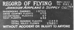 RECORD OF FLYING JOHNSON AIRPLANE & SUPPLY CO. PASSENGERS CARRIED 10722 CROSS COUNTRY FLIGHTS 490 ADVERTISING FLIGHTS 67 TEST FLIGHTS 642 TOTAL NUMBER FLIGHTS 11640 TOTAL MILES FLOWN 376821 WITHOUT ACCIDENT OR INJURY TO ANYONE |